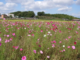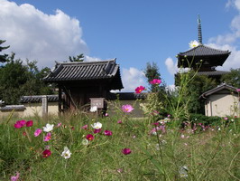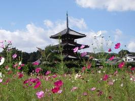 法隆寺のすぐ近く。コスモスが広がる秋の大和路です。