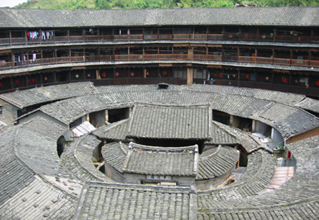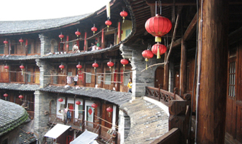 バスの終点のすぐそばにも、例にもれず大きな土楼がどっしりと佇んでいた。円形のものだ。客引きにとりあえず付いていって、その土楼の中を見せてもらうことにした。外見は、土の壁でできている、小さな窓以外はのっぺらぼうの、丸くて巨大な建物。一つだけある門から中に入ると、外からは想像できなかった、整然と区切られているいくつもの部屋が見えた。土の壁の中は、木造建築となっており屋根は瓦である。トン族やミャオ族と同じように、木の文化を持っているのだ。