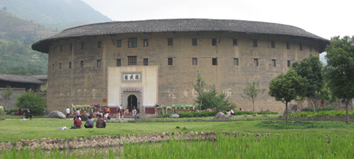 土楼民族文化村に入りしばらく歩くと、あちこちに土楼が見え始める。数も結構あり、形も四角いのやら丸いのやら、いろいろだ。一番目を引いたのは、ネットで名前を知ってた「振成楼」だ。何でも”土楼の王子”というあだ名がついているらしい。中に入ると、いきなりお土産屋が構えている。あぁ、観光地なんだなぁ、と思う。先程客引きが案内してくれた土楼とは大違いで、土楼の保存にも気を使っているというのが分かる。入場料を取るぐらいなんだから当たり前なのだろうし、そうする義務もあるだろう。観光客が落としていくお金で、ここの土楼は守られているし、彼らの生活も成り立っているのだ。人目にさらされる道を選び、生き延びていく文化。