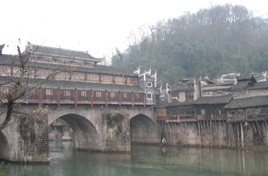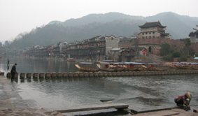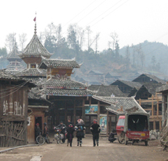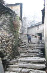 最初は見るもの見るものが珍しく、感嘆の声を上げていたのだが、贅沢にも時間が経つに連れて同じような景色にもかなり慣れてくる。そして2時間後には、心理的にかなりの満腹状態でツアー終了となった。 昼食後、バスで吉首まで行き(約1時間)、そこで王村行きに乗り換える。王村は、S嬢お気に入りの中国映画の舞台になった場所であり、彼女のたっての希望で今回行ってみることにしたのだ。 1時間強で王村に到着。バス停からしばらく歩き、探し求めていた映画ロケ地に着いたのだが、かなり観光地化されている様子にS嬢はショックを隠せない。他の家の方が昔の雰囲気を湛えていたりと、思い通りにはいかないこともある。