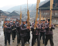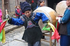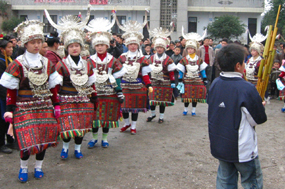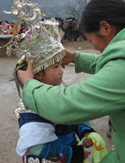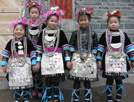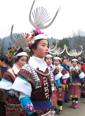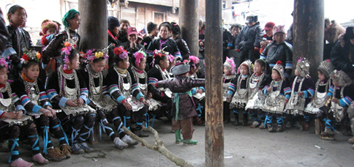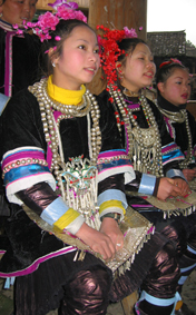 しばらくすると、外が賑やかになってきた。呉先生はまだ始まらないと言っていたが、どうにも気になったので外に出てみることにした。すると、鮮やかな民族衣装に身を包んだ子供達の姿があちこちで目に止まった。銀が施された衣服、銀の大きな首飾り、それからきれいな花で飾られた結い上げられた髪。鼓楼の周りでは芦笙の練習をしている男性の姿も見られた。お祭りムードが盛り上がってきた。 呉先生の家まで戻ってみると、娘さんもきれいに着飾っていた。誘いに来た友達の中には、前に小黄に来た時に見かけた少女もいた。カメラを向けると、恥じらいながらもその表情にはうれしさと誇らしさが見てとれた。