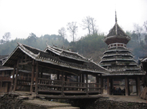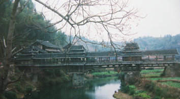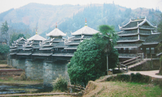 三江の風雨橋は本当に美しかった。今でも目を閉じると、橋脚の上に楼閣が建てられている立派で勇壮な、しかし木のぬくもりを持った優しい橋が浮かんでくる。しかし、残念なことに旅の途中でCD-Rに焼いた橋の写真のデータが壊れてしまった。そこで一緒に旅したS嬢の写真を掲載させてもらう。 |