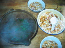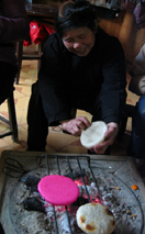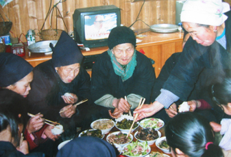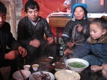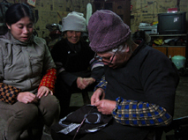 そして夜中の12時を迎える頃には、子供達も一緒に花火を上げ、爆竹を鳴らして新年を祝う。長春ほど派手ではなかったけど、同じように賑やかに新しい年を迎えるんだなぁ、と思った。花火をうれしそうに上げていたおじいちゃん!なかなかイカシテました。 こうして新しい年を迎え、12時半に就寝。でも冷えきった部屋ではなかなか寝付けなかった。 9日はいつもご飯を食べていたトン郷餐館のおばちゃんの家に、ずうずうしくもお邪魔する約束をしていた。11時に旅館に迎えに来てくれたのだが、部屋の鍵を昨夜失くしてしまったS嬢はしばらく鍵を探してから行くということで、まず私だけおばちゃんの家にお邪魔することになった。 平屋のその家に入ると、おばあちゃんが炭火の上で唐辛子をあぶっている所だった。火の側に座ってしばらくその様子を見ていたら、そのうちおじいちゃんがやって来た。簡単な会話を交わしているうちに、そのおじいちゃんは小黄に知り合いがいることが分かった!!! 数日後にまた小黄に行くつもりということを告げて、おじいちゃんに知り合いへの紹介文を書いてもらった。これはラッキー!縁ですな、縁。