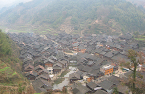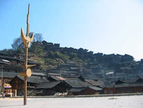 肇興はトン族の村の中で一番大きいらしい。それにゲストハウスもある、とガイドブックにある。交通の便もいいだろうし、ここで春節を過ごせばいろいろな面で便利かもしれない。そう思って溶江からバスを乗り継いで肇興にやって来たのは、大晦日の前日、2月7日だった。 肇興の中心地らしき場所でバスを降りる。時折爆竹を鳴らす音が響いている。春節が近付いてきていることを実感させる音だ。