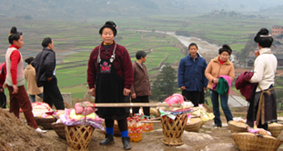 S嬢と旅行の計画を立てた時、西江は予定に入っていなかった。旅行をしていくうちに時間に余裕ができてきたので、ガイドブックのとある言葉に釣られて急遽行って見ることに決めたのだった。『ミャオ族最大の村である西江の刺繍の技術は高い』という興味をそそられる言葉。 従江から凱里行きのバスに乗り、凱里の手前30kmぐらいのところにある雷山で降りた。雷山まではかなりの山道だったので、バス酔いする乗客が続出。みんな窓から外に向かってゲーゲーやっている。日本では信じられない光景だ。こっちの気分まで悪くなりそう。勘弁してくれ…。 雷山に到着するまでの間、約1時間ごとに集落を通り過ぎた。そのうち、2つの村でー集(ガンジー)を開催していた。ー集は正月に必要なモノから日用品、また鶏や豚などの家畜などを道で売る、青空市場のようなものだ。 車が動けなくなるぐらい、それらを買い求める人々で道は塞がっている。ごった返す人々の中には、きれいな民族衣装で全身着飾っている若い娘達もいて、見ているだけでワクワクした。これから訪れる西江もこんなに賑やかだったらいいなぁ、といった期待も大きくなっていった。