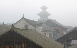 途中からかなり霧が濃くなってきた。「どうか晴れますように!」という願いも届かぬまま、約1時間半で増沖に到着した。車は村よりも高い位置に停車した。車から降りると、霧に包まれた鼓楼と黒い瓦屋根の村が眼下に広がっていた。