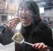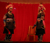 そして夜の8時半から、いよいよ噂の「トン劇」を見に出かける。旅館の近くの鼓楼の側に舞台があり、村の人達が集まり始めていた。鼓楼の下は火が焚かれていて暖かい。火の側で開演を待つことにした。 爆竹の音で劇は始まった。まずは、男の人達が登場。民族衣装を着ている人も、そうでない人もいる。何をするのかと思いきや、中心にいる老人の周りを男どもが手を繋いでクルクル回っている。「かごめかごめ」でもしている感じだ。真ん中にいる老人は、歌?お話?何だかよく分からない事を口にしている。しばらくすると、真ん中の老人が交代する。 …うーむ、何か特別な意味を持つ動作なのかもしれないが、非常に単調な劇??というのが感想。