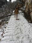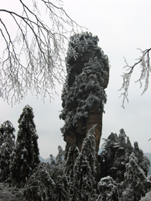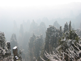 翌日は朝9時に出発。今日は天子山に登るということだ。私達、頑張るなぁ!! 張家界森林公園内を走っているシャトルバスに乗り、天子山登山口まで移動して10時に登り始める。今日は昨日の曇天とは変わって天気がよく、地面の雪も少しずつ溶け始め、登山道の周りの木々の氷もバラバラと落ちてくる。結構大きな氷の塊も降ってくるので危険だ。