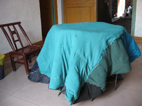 食事の後は、おばあちゃんが刺繍を売り込んできた。ご馳走になったし、刺繍も欲しいと思っていたので1枚買った(50元を値切って42元)。月をイメージしているという丁寧で細かい刺繍が紺地に映えていてとても美しい。 午後、旅館に帰ってから、前日この宿にやって来た2人の日本人(何と奇遇な!)+ガイドさんと、火を囲んでずっとおしゃべりしていた。彼女達は旅行社と通してここにやって来ており、今日は朝から「龍図」という村の観光に出かけていた。車があるのでいろんな所に行けるのだ。彼女達が龍図で撮った写真で、ガイドブックに載っているのと同じ民族衣装を来た美しいトン族女性の様子を見ることができた。 しかし、不思議とそこまでうらやましい気持ちにはならなかった。おばちゃんの家で美味しいものにありつけ、素朴な交流ができたからか…な? 10日も日中はどこにも行けず、ずっと肇興に閉じ込められていた。交通手段がないというのは結構つらいものだ。三輪バイクも春節のためにあまり動いてないし、公共のバスも通常通りには走ってない。 今日の夜、ここ肇興で「トン劇」という出し物があると聞いていた。だから、予定よりも長めに滞在することにしたのだ。だが…あまりにも无聊(ヒマ)!!!