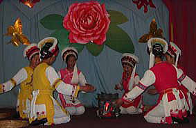 喜洲では第二の目的『三道茶』を飲んだ。白族の民族舞踏を鑑賞しながら、三杯のお茶を飲む。