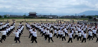 | 奈良の「平城京天平際」の行事で、「奈良県武術太極拳連盟設立25周年記念500人の集団演武」平城宮跡大極殿前広場に参加しました。 快晴に恵まれ、24式太極拳、入門太極拳を演武。そして総合太極拳、双扇、32式太極剣(見学)、最高の環境の中、太極拳集団演武を経験しました。 |