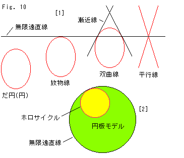 平行線は与えられた点Pで交わるとします。 そうすると、無限遠直線がその点Pを通ります。 いいかえると、私たちは無限遠直線をどこにでも自由に引くことができます。 ただし、平行線はその無限遠直線上で交わらなければなりません。 この見方からすると、Fig.10は、2次曲線と平行線がしたがわねばならない規約を示しています。