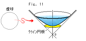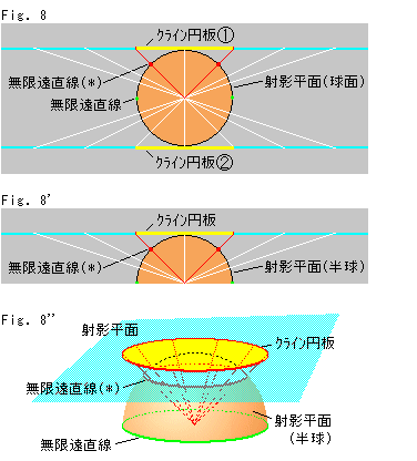 Fig.8'は、Fig.8の下半分を切り捨てたものです。 球全体は必要とはしないことが分かったからです。 これで球面の対心点を同一視することによる問題も同時にケリがつきます。 クライン円板の対心点は同一視されるものではありません。