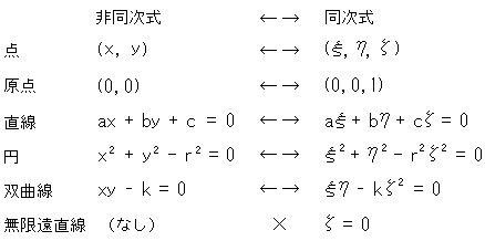 (クシイ,イータ,ツェター)で表わされます。 文字は3つですけれども、あくまで平面上です。 同次座標とふつうの座標(非同次座標)との関係は、