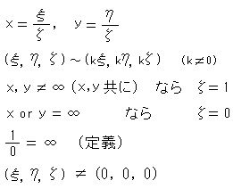 で表わすと、ふつうの平面から射影平面に変わるのです。 もっとも、x,yのままで射影平面を扱うこともできますが、それは無限遠直線との関わりを除いてのことです。