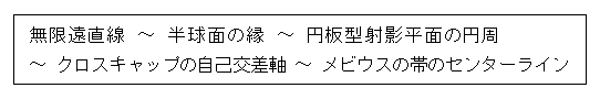 ここでまた気付きます。 このメビウスの帯のセンターラインは、クロスキャップの自己交差の交線に対応するものであり、それは無限遠直線からなるものですから、センターラインのある側は広大無辺なところだと考えることができます。 すると、赤い円の外側は、やはり「外側は内側より広い」という"常識"が通用するところではありませんか!