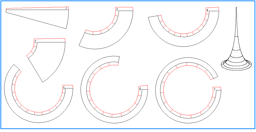擬球と半球の紙細工のためのアニュラスです。 球面の形状は十分知られていますが、それも作って擬球と対比してみると、それぞれの特徴がよくわかります。 印刷して利用してください。 いずれも、完成図のところを除いてA4版の紙に印刷できる大きさにしてあります。 しかし拡大コピーして、もっと大きいのを作るのも面白いですよ。 赤い線のところは、糊しろと裂き目です。