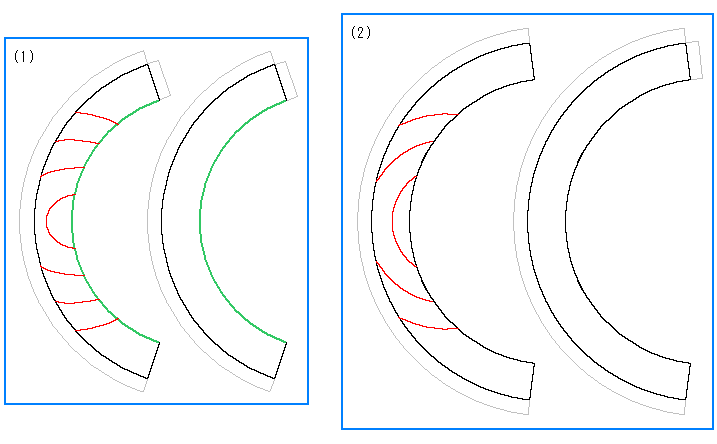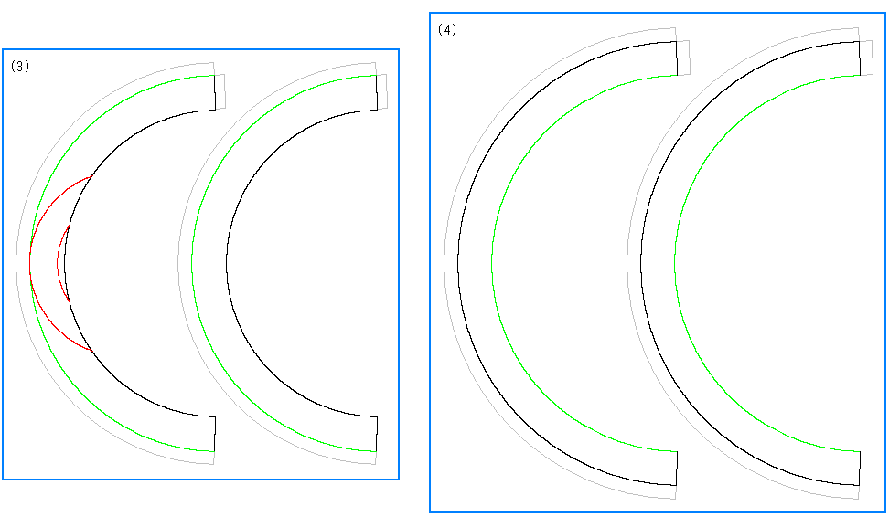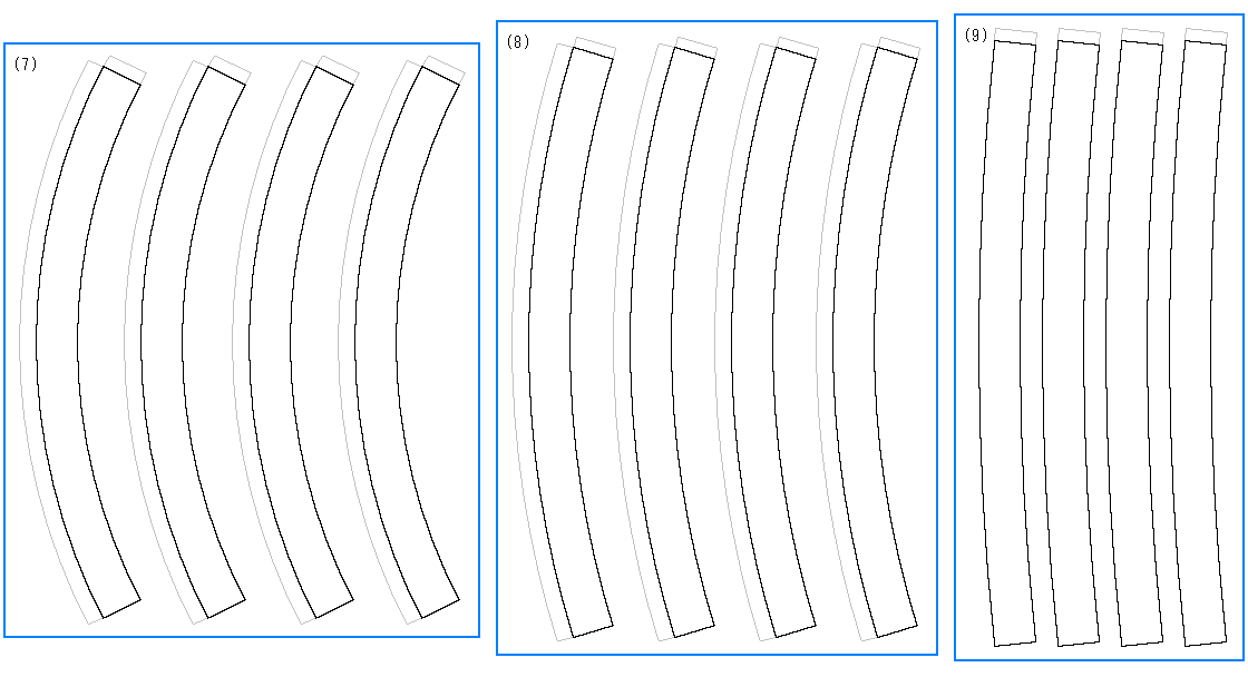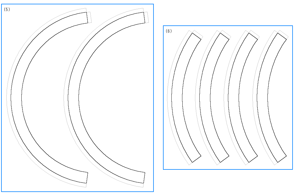 擬球部分は、[Fig.27の型紙]のと同じですので、それによってください。 ここにあるのは、トーラス部分です。 (1)の濃い太い緑色の円弧が擬球との接合部です。 (4),(5)の細い緑色の円弧がトーラスの天底です。 その天底(3)までで仕上げてもかまいません。 各囲みごとに1周分になっています。