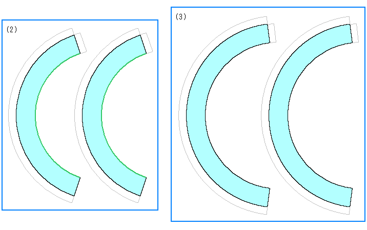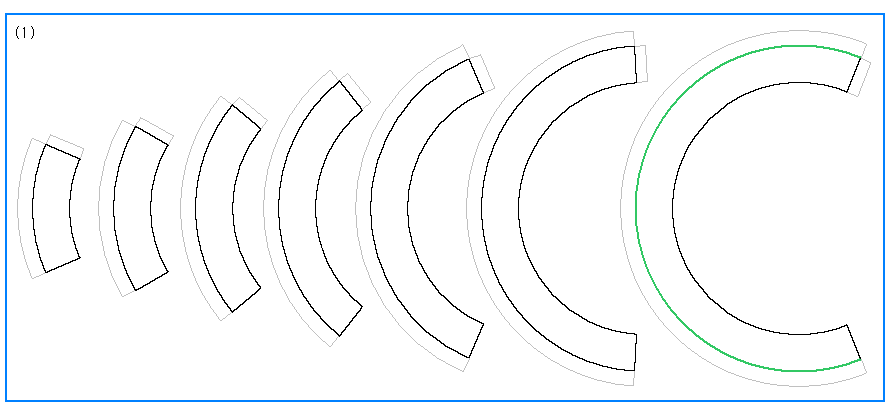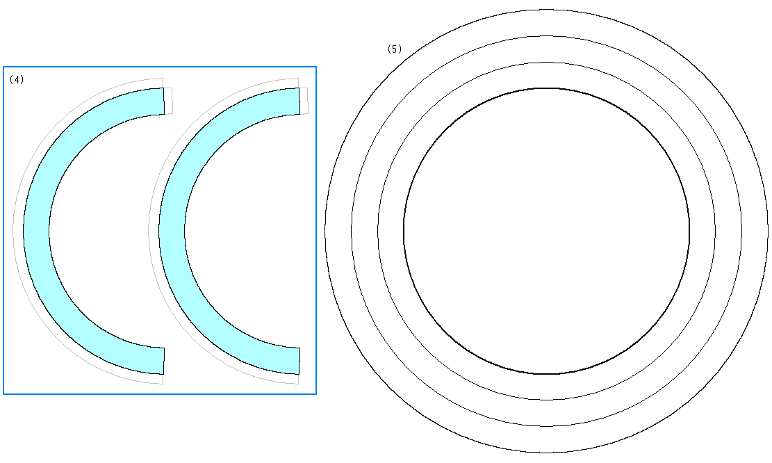 (1)が擬球部分で、(2)〜(4)がトーラス部分、(5)が平面部分です。 (2)〜(4)は2つで1周分です。 (2)の濃い太い緑色の円弧が擬球との接合部です。 (4)の外周と(5)の内周がトーラスの天底です。(アニュラス上の同心円や直線の描き込みは省いています。)