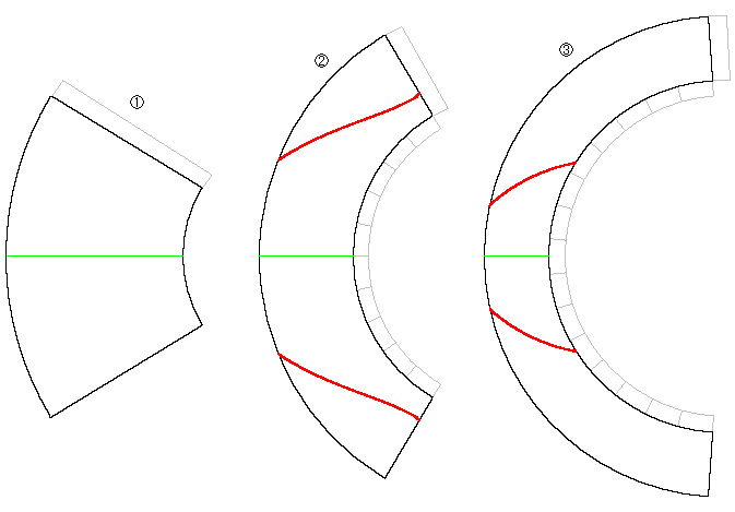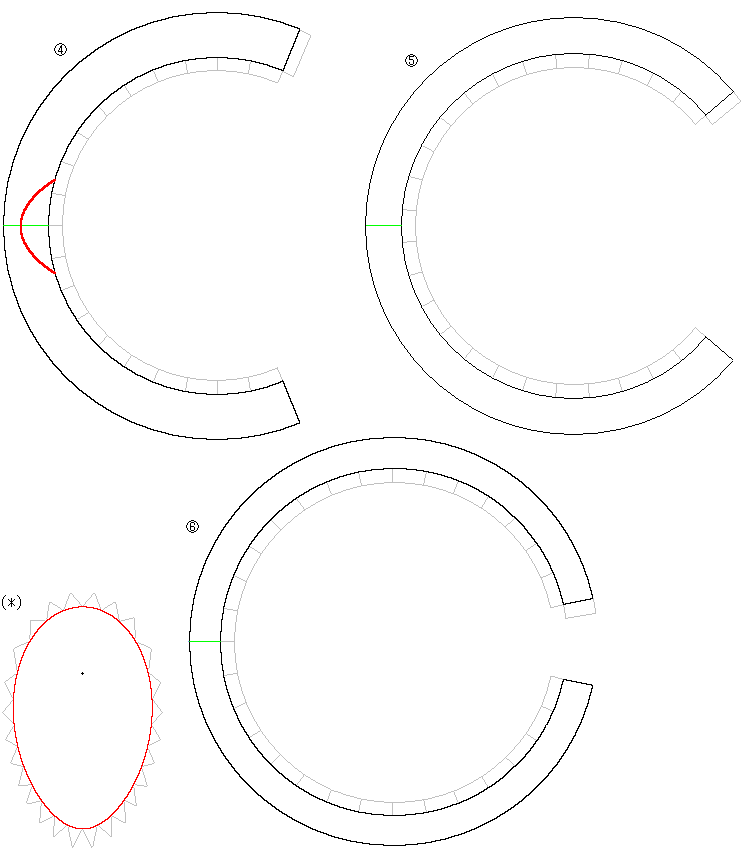 擬球を作って、それを切ります。 型紙の赤い曲線は、カットラインです。 よければ、断面に卵形(*)を貼ってもよいでしよう。 卵形の中の黒い点は、擬球の軸が通る位置です。