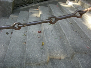 出発してまもなく右手に石鎚神社があった。寺巡りの途中で神社に行くのはどうかと思ったが、日本の神仏は融通無碍だとも言われているので迷わず参拝。 大きな神社で、ご神体は石鎚山とのこと。石鎚山の昔の鎖場の鎖を階段に張っていたが、あまりの大きさに思わずシャッターを押した。 ※石鎚山は標高1982メートルで西日本一の高峰、日本百名山の一つに数えられている。
