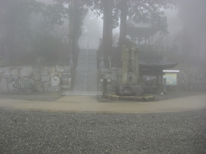 雨具を着てスタート、目指す66番札所は、標高910mで四国霊場の中で最も高い所にある。宿は標高240m、急な上り坂なので下着は汗でグッショリ。頂上付近は、小ぬか雨、上着(雨具)を脱ぐと涼しくて気持ちがいい。66番、雲辺寺は霧に包まれて文字通り雲の中、雲の中の雲辺寺もなかなか乙なものだった。 次の67番は標高75m、一気に下る、山道は雨でぬかるんでいる、度々滑った、1回ころんだ。その内晴れ間が見えてきたので雨具を脱いで身軽になった。 69番観音寺の近くに大平正芳記念館があったので立ち寄る。総理時代、地元の事務所にしていたようだが地味な建物だった。
