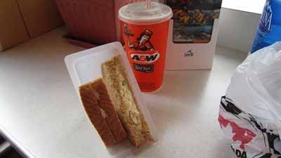 "A&W" ガソリンスタンドにあるコンビニ。と言ってもろくなもはない。他に店がないので文句は言えない。WiFiができる。
