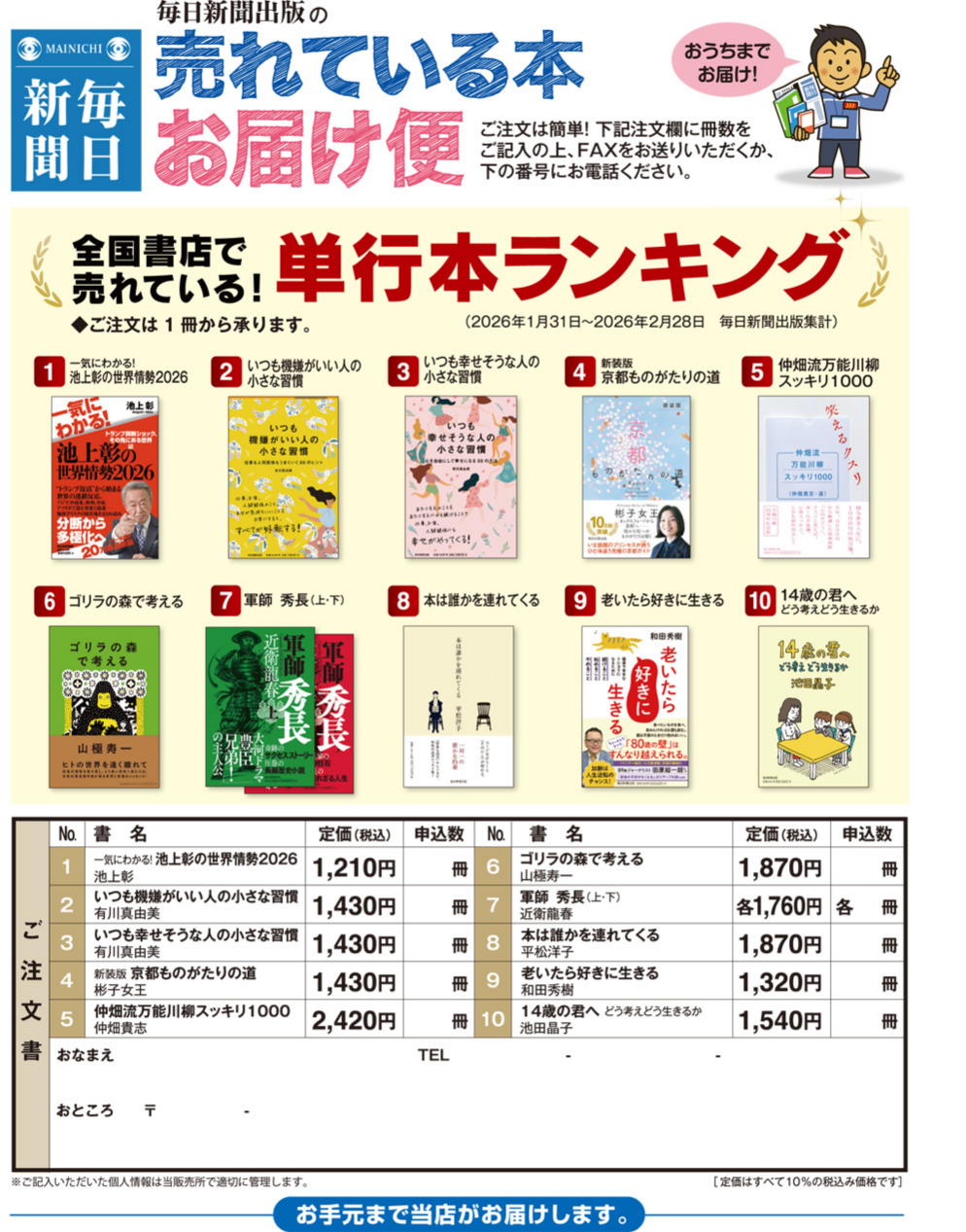 | 毎日新聞(朝刊7日間)・毎日小学生新聞(7日間)を「試しに読んでみたい」という方は下記URLからお申し込みください。無料でお届けします。対象は日本国内のみとさせていただきます。一部地域で実施できない場合もございます。毎日小学生新聞は見本紙を郵送する場合もあります。ご了承ください。原則としてお申し込み日の3営業日(土日祝日を除いた日)後以降の配達とさせていただきます。年末年始等は別途配達開始日を設定させていただきます。複数回の試読お申し込みはお断りさせていただく場合もございます。 ※試読申込 https://form.mainichi.co.jp/annuncio/koudoku/shidoku/form.html |