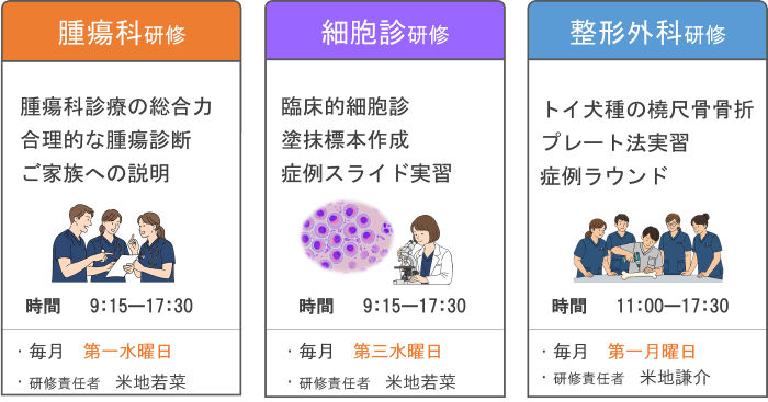 | s腫瘍科診療現場で即戦力になる”臨床的”細胞診を学びます。基礎から実践、インプットからアウトプットを折り混ぜた一年間の研修です。上記の腫瘍科研修とは開催曜日が異なっていますので2コース同時受講も可能です。 |