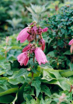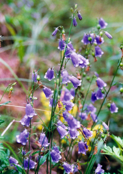 釣鐘形の青紫色の花が下向きに咲く多年草。