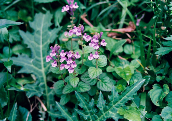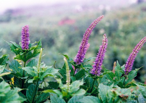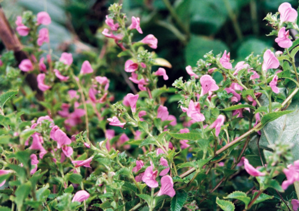 枝別れし、紅紫色の唇形の花を付け、全体に良い香りがある。