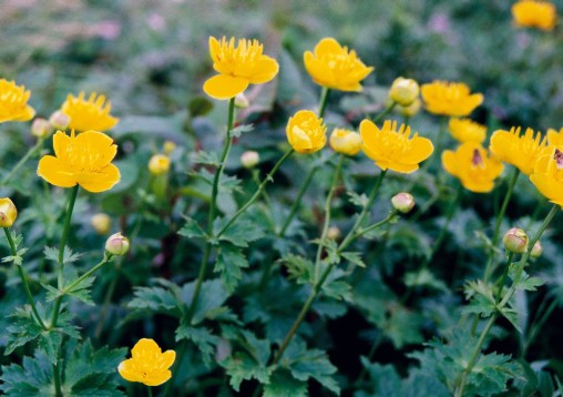 深山の草地や林の縁などに生える多年草で、花の色が黄色で梅の花の形に