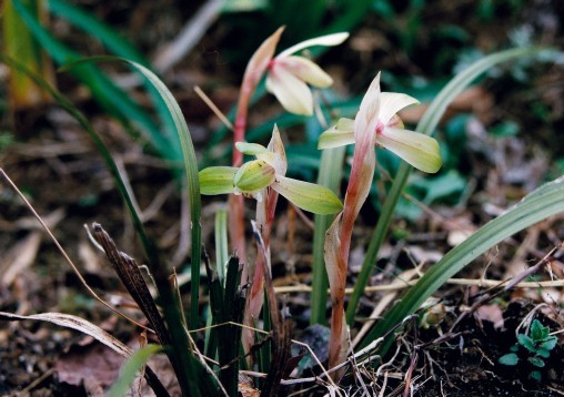 夏には葉が枯れ、そこから花茎が出て黄赤色の花が咲く多年草。