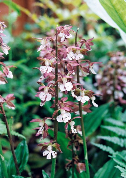 萼片は紫褐色、側花弁と唇片は白色または淡紫色の花を付ける多年草。
