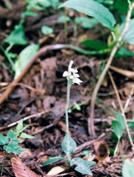 深山の針葉樹林下に生える多年草、葉の表面に白色の網目状の斑紋が入る