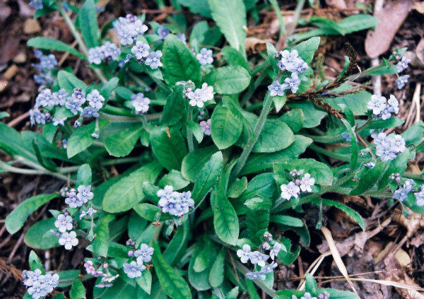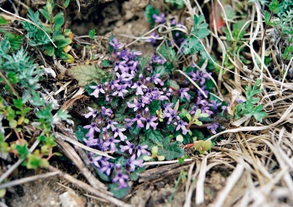 春の頃、葉の脇に濃紫色の花を付ける、茎は地面を張って広がる。