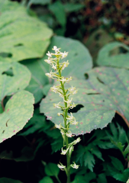 茎の先端に淡緑色の花を総状に多数付け、花の形が昆虫に似ている。