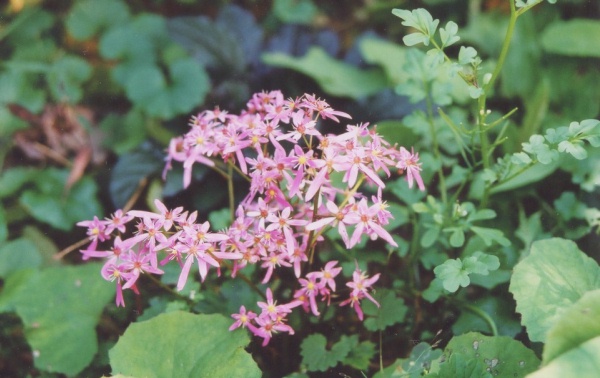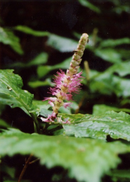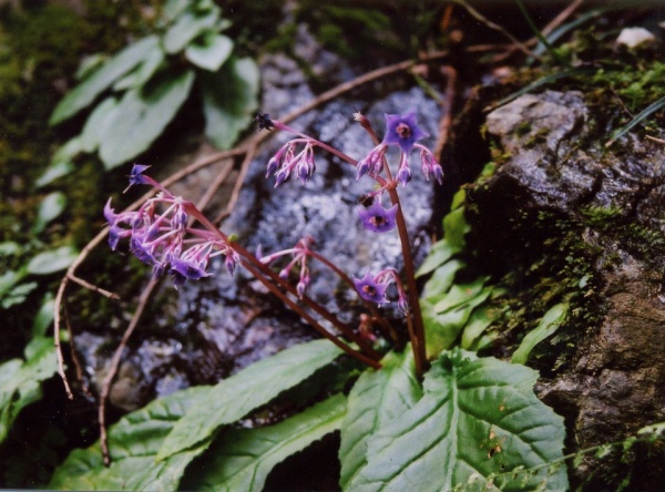 山地の湿った岩盤に咲く多年草、大きな葉が1〜2枚付く。