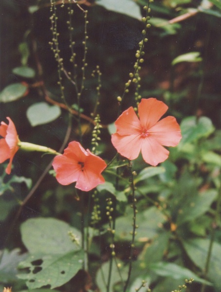 写真の花は栽培種で赤色ですが、自然の物は白い花が大の字の形に咲く。