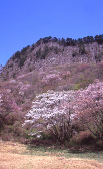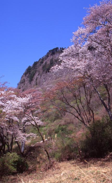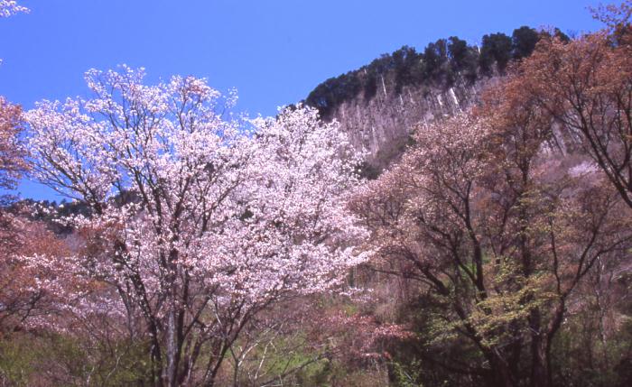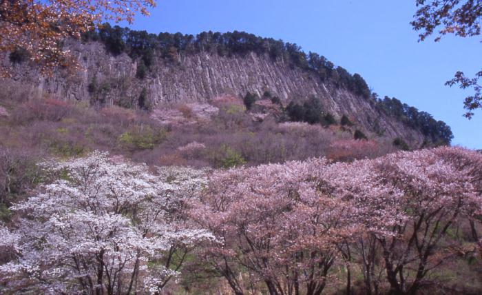 写真はH16年の春に 奈良県大宇陀郡曽爾村で撮った写真です。 切り立った屏風岩は観光地として人気のある場所です。 春は桜、秋は紅葉の時期に夜にライトアップがされます。 下から見るとライトアップされた、岩並が幻想的な趣を 出してくれます、初めて見る人はビックリされるでしょう。