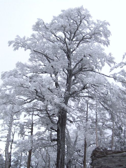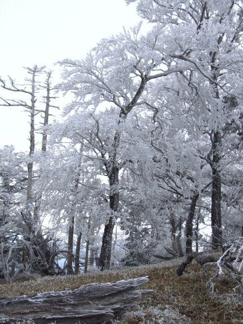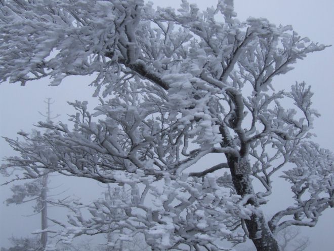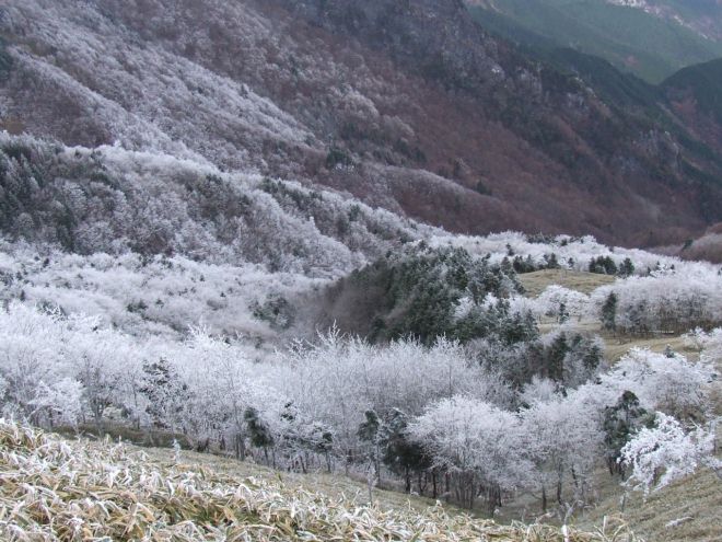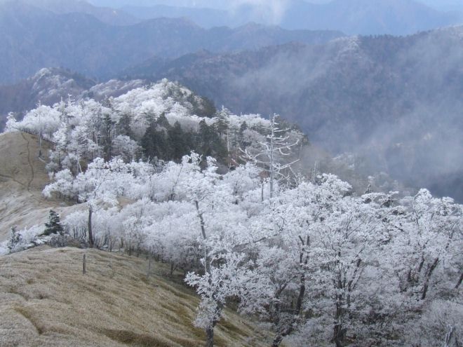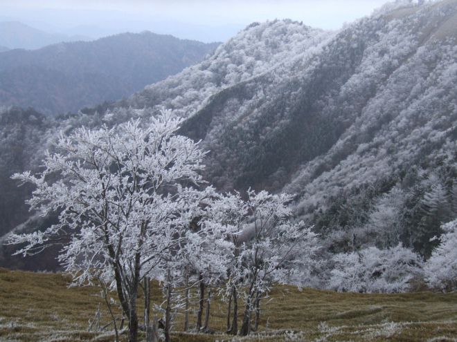写真の霧氷は平成17年11月半ばに、 大台ヶ原付近の山で撮った物です。 登山するまではまさか11月に霧氷に出会うとは想像していませんでしたが、 大台ヶ原に向かう途中で山の上の方に霧氷が見られ信じられませんでした。 目的地に到着すると、登山する大台ヶ原一帯が霧氷に 覆われていました、季節はずれの霧氷にみんな大喜びでした。 その時の写真を何枚か掲載します