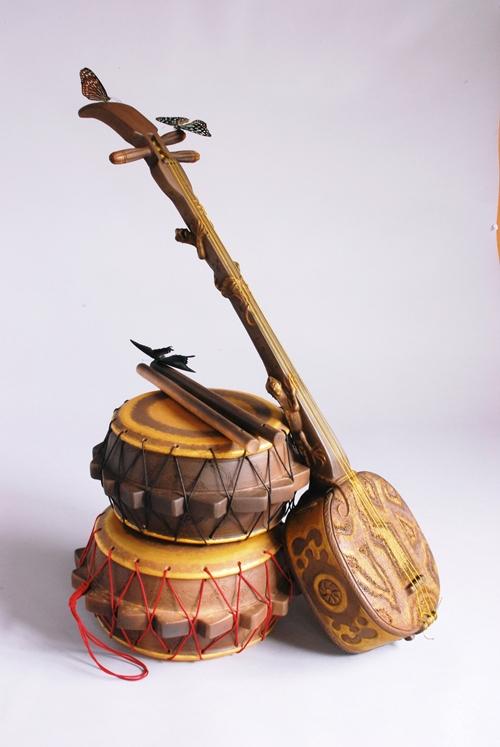 折にふれ、島唄や踊りの場で奏でられる。チジン(太鼓)とサンシン(蛇三線)。その唄声と音色の周囲には、今はなき、ゆかりの島人たちの気配も集う。