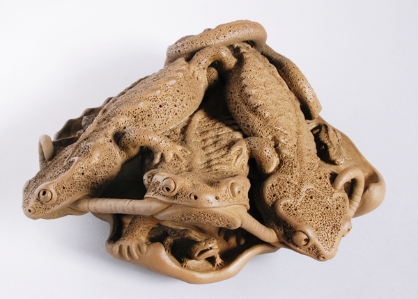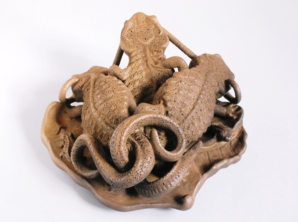 大きなミミズを取り合うイボイモリ。日頃は仲良く身を寄せ合っている。
