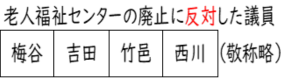 私が反対した理由 ・現在も支障なく使われている施設であること ・代替施設まで遠く、移動が困難な方がおられること ・急いで廃止する理由が見当たらないこと