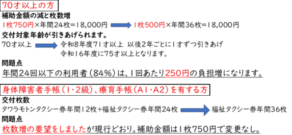 2.タクシーの初乗り運賃補助制度(タワラモトンタクシー) の見直し 高齢者や障害のある方の支援を支えてきた、 タワラモトンタクシーの運賃補助制度が見直されます。 この制度は、町の要綱で定めており議員が最終決定 できるものではありませんが、外出支援の後退に つながる可能性があるとして、 議会で反対意見を述べました。 主な内容と問題点です。  一般質問 (本会議の場で町執行部に対し議員が 直接対話でき議事録に残るものです。) 今議会で、@選挙公報発行実態と選挙ポスターの 公費負担の見直し、A青垣生涯学習センターの リニューアルの質問をしました。