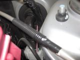 考えて考えて、グローブボックス奥の隙間に治具を差し込み、バッテリー奥のグロメットから線を引き出し