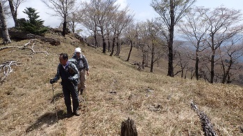 当初計画では 釈迦ヶ岳登山口から行仙岳までとしていたが 行仙岳の登山口となるR425の災害復旧工事の為交通時間規制があり又白谷トンネルは全面通行止め と成っている為配車が出来ない。 そこで代替えのコースを考える。 第一案は釈迦ヶ岳登山口から上葛川の玉置山登山口までとする。 第二案は前鬼から太古の辻へ登り行仙岳から下山する。 今回は小屋泊なので小屋での睡眠不足があった場合 又同行のk2さんが膝に悩みを抱えていることを考慮して 二日目の歩行距離の短い第二案とした。 1日目 行仙岳登山口に置き車をして前鬼登山口のなるべく近いところでテン泊だ。 R425の通行可能時間帯は11:40〜12:30 及び14:40〜15:00である。 計画では11:40迄に工事地点まで行き12:30迄に置き車をして戻ってくる。 万一間に合わなかった時は14:40迄カンズメになってしまうため昼食は準備 して置く。 時間との勝負となる計画だったが 見事に計画通り実施できた。 ![]() 池原ダム下のキャンプ場 テント設営完了 2日目 前鬼登山口には既に2台が止まっている。 北見の車がある。 話をしてみるとなんと私と同年齢だ。 北見を出てもう1か月に成るそうだ。 九州にも 行って来たそうだ。 今日は釈迦ヶ岳へ向かうと言う。 1足先にもう1台の静岡ナンバーの人と出発した。 6:00 前鬼登山口を出発。 二十数年も前に始めて漸く完走することになる。 気持ちは軽やかだが荷は重い。 1足先に出た二人は影さえ見えない。 9:00 急登を登り切り 今回の出発点となる"太古の辻"に到着した。 流石奥駈道 地蔵岳 般若岳 涅槃岳 証誠無漏岳 阿須迦利岳と宗教的名称の山が続くが尾根筋の雰囲気の良い縦走路だ。 静かな縦走路だ。 途中一人が追い付いてきた。 朝に逢った静岡の人だ。 大日岳に登って来たそうだ。 持経宿泊? 羨ましいな〜 明日は仕事なので 行ける所まで行ってピストンするそうだ。 足早に追い越していった。 そうだよね。 仕事を持っていた時分は皆そうしていたよね! 15:00 予定より早く持経宿に着いた。 暖炉が有り 薪ストーブが有り マキも準備されていた。 水までタンクに汲み置きされている。 押し入れを開けると敷き用の毛布と掛け用の毛布が綺麗に収納されている。 まことに気持ちのいい小屋だ。 "新宮山彦グループ"の皆さんのボランテイアで維持されている。 本当にありがたいことです。 この日の宿泊は我々三人だけだった。 ![]() 縦走路 太古の辻に到着 いい雰囲気の縦走路 天気が良すぎて暑い ![]() シャクナゲの花が咲き誇る 今夜の小屋 持経宿に到着 朝食事を終え 備え付けの箒で丁寧に掃除する。 来た時よりも確実に綺麗になったね! 其々に納得顔で戸締りをし6:15小屋を出発する。 小屋を出るとすぐ"森の巨人たち100選"の標識 林野庁の進める次世代に残す巨樹の内62番に選定された"持経千年桧"だ。 奈良県ではこの木だけだ。 途中アケボノツツジの開花が観られた。 10:10 ついに到着しました。 行仙岳 20年の歳月を経てようやく繋がりました。 長く掛かった分だけ喜びも大きいものだ。 ![]() 森の巨人 持経千年桧 アケボノツツジ k2さん フーさんの協力を得て"下山口に車を配車して置く"と言うことが出来漸く80kmにも及ぶ山岳古道 奥駈道の全縦走を20年振りに達成することが出来た。 k2さん フーさん有難うございました。 感謝です。 これで心残りの物は処理できた。 あとは百名山20座制覇!! 頑張るぞ。 ページトップへ トップページへ |