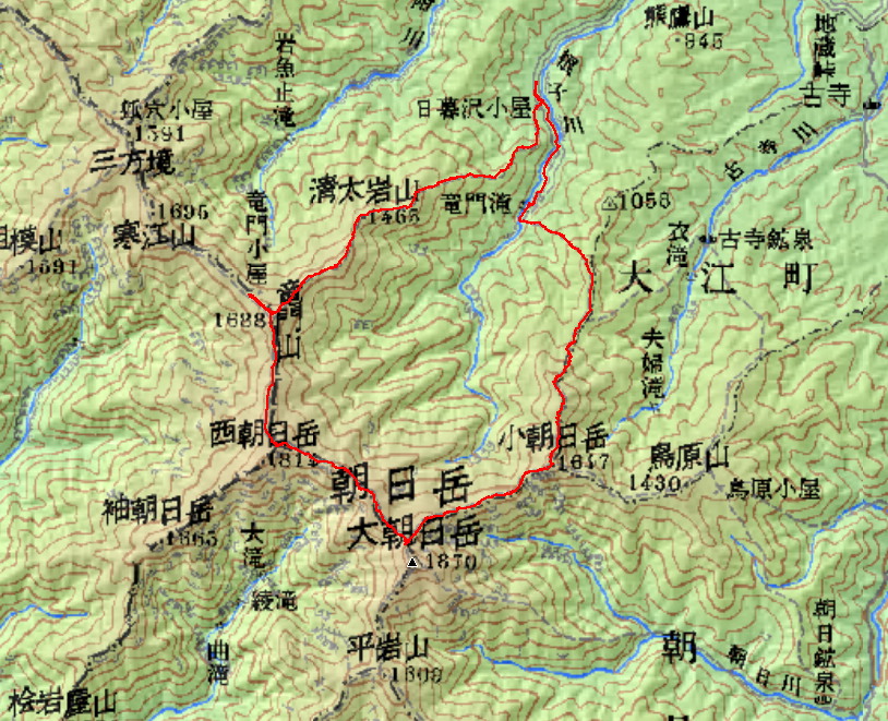 | コースタイム | 日暮沢登山口6:40→10:40小朝日岳11:10→13:00大朝日小屋13:25 →13:40大朝日岳→14:10大朝日小屋(泊り) 大朝日小屋5:30→7:10西朝日岳→750竜門山→8:10竜門小屋→竜門分岐 →10:00清太岩山→12:20日暮沢登山口 |