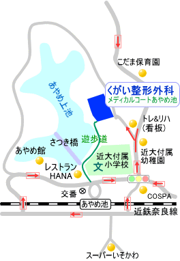 近鉄奈良線の北側を平行に走る「県道104号線(谷田奈良線)」を西へ → 「コスパ(COSPA)テニスクラブ」の交差点を右折(「あやめ池北通り」を北上) |