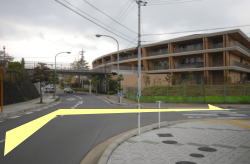 こだま保育園を過ぎて、前に茶色の近大附属小学校の建物と歩道橋が見えてきたら、その直前の三叉路を右折 |